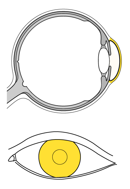 The clear window forming the front of the eye. It lets light into the eye, assisting with focusing to enable clear vision.